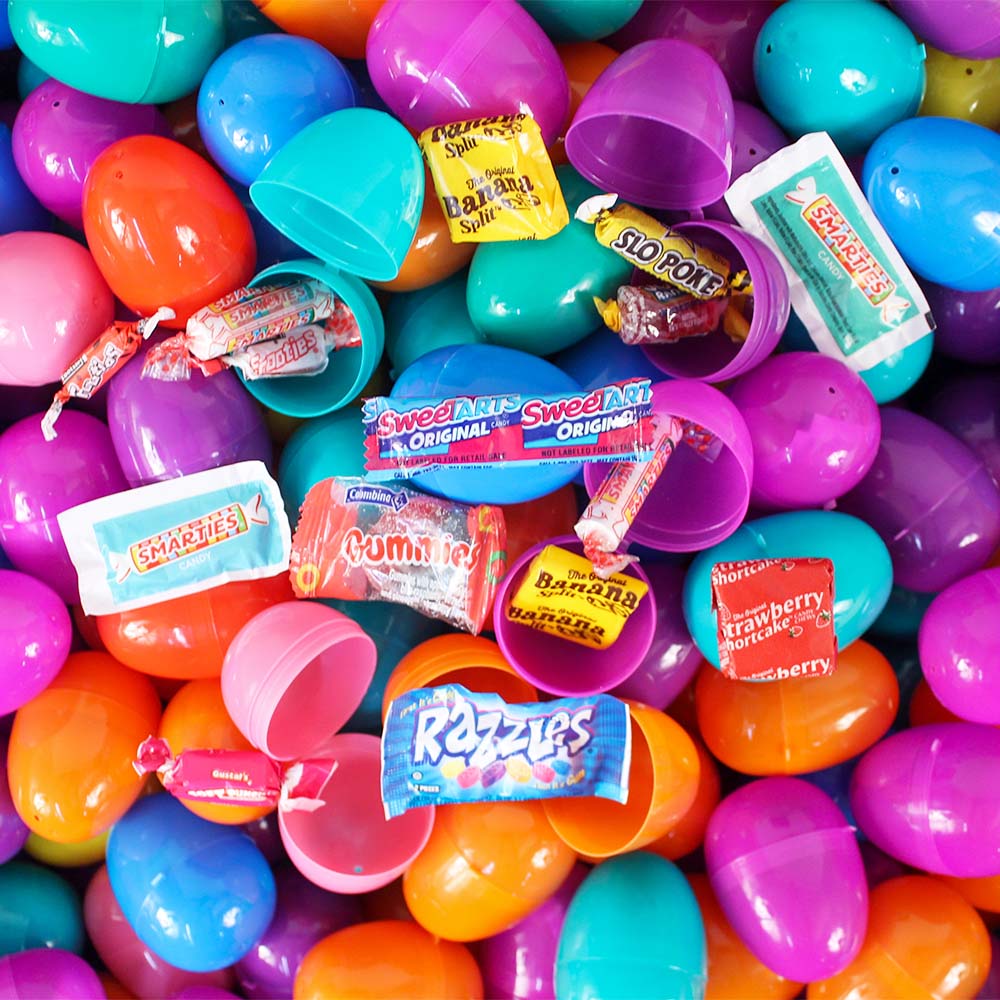 Twice the deliciousness! Our signature bright 10-color hinged Easter eggs filled with two candies from our large assortment of individually wrapped candy. These are the perfect prefilled candy eggs for when one piece of candy just isn't enough! Comes with 10 free golden eggs for added fun.