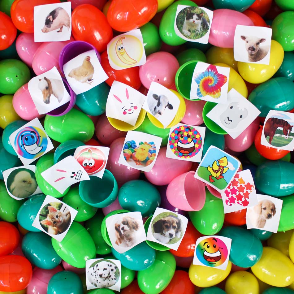 Our standard size 10-color Easter eggs filled with a variety of sticker types, two in each egg. Plus, each case comes with 10 free golden eggs! These eggs are great for children under 3.