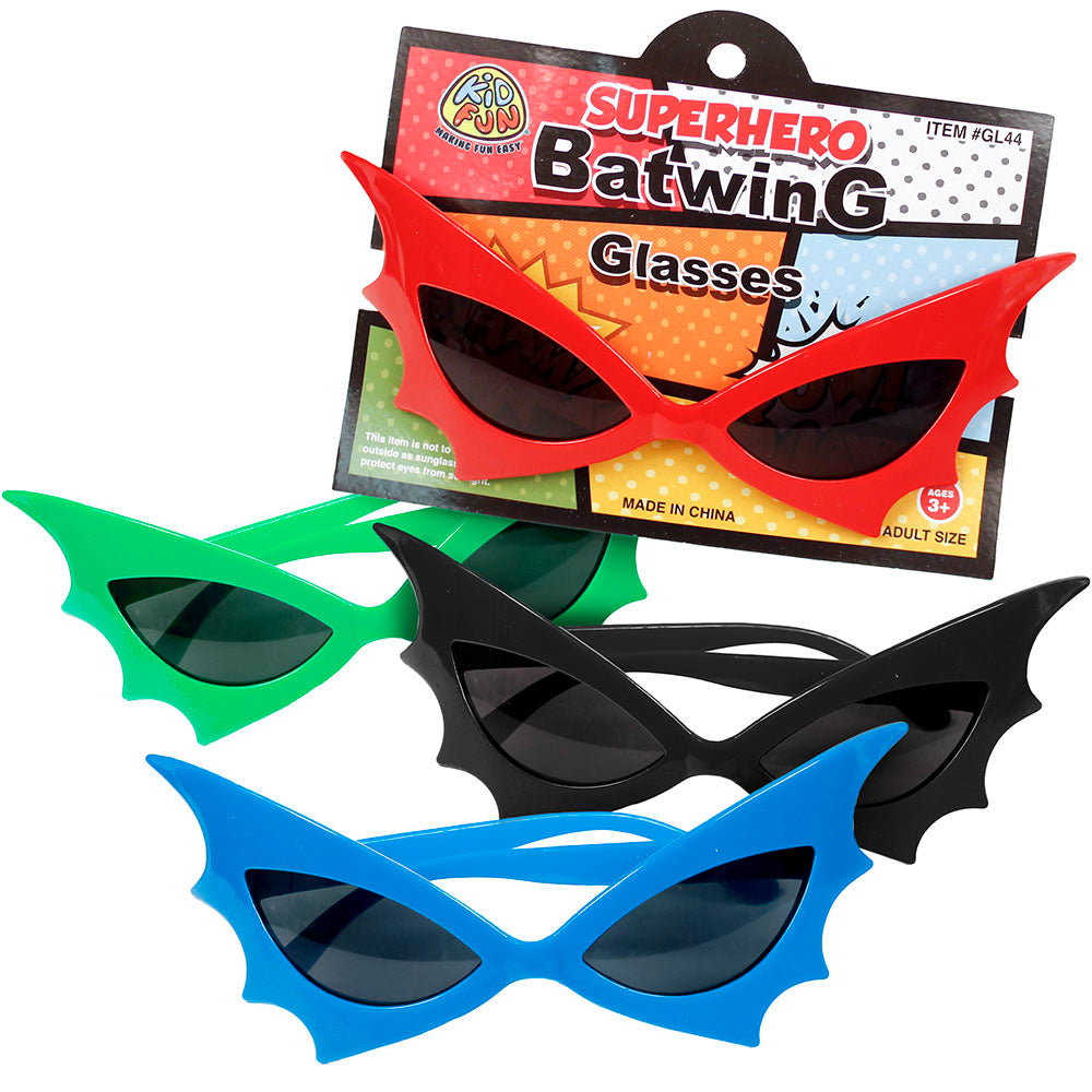 Batwing superhero novelty glasses in assorted colors. 6-1/2" wide. One size fits most. Sold by the dozen.