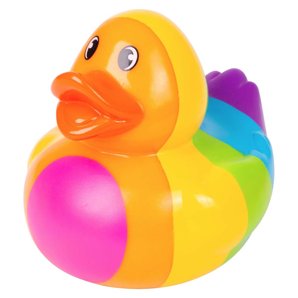 This big rubber duck comes in a bright rainbow multi-color design. With its flashy color scheme and larger size, this duck will be the pride of your ducky collection.