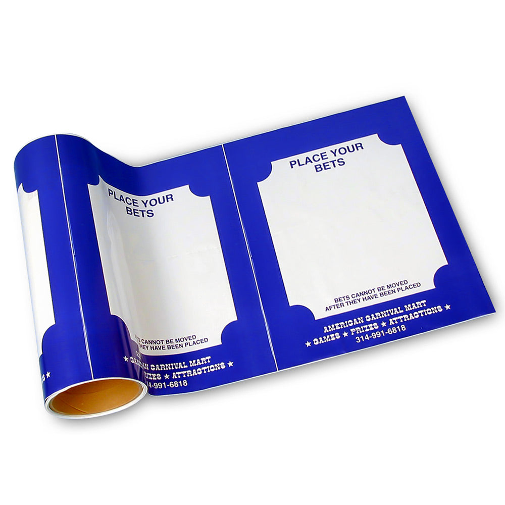 Blank laydowns for carnival games where the player has to guess the outcome, like prize wheels or pig races. Fill in the options with marker in the open rectangles where players can place their bets. Cut off how much you need. 100' medium weight plastic roll, approx. 152 boxes.