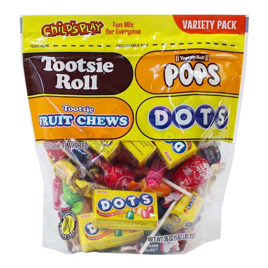 A variety mix of four different types of candies; Tootsie Rolls, Tootsie Pops, Tootsie Fruit Chews and DOTS.
