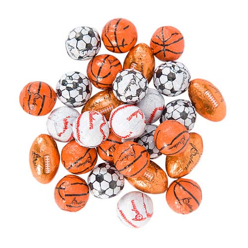 Bulk mini milk chocolate footballs, soccer balls, baseballs and basketballs, mixed together in an assortment. Perfect for sports-themed party favors or just satisfying a sweet tooth, this pack of 100 chocolate sports balls will bring some fun and flavor to any occasion. Their small size is perfect for filling Easter Eggs, or add them to your Christmas stocking fillers.