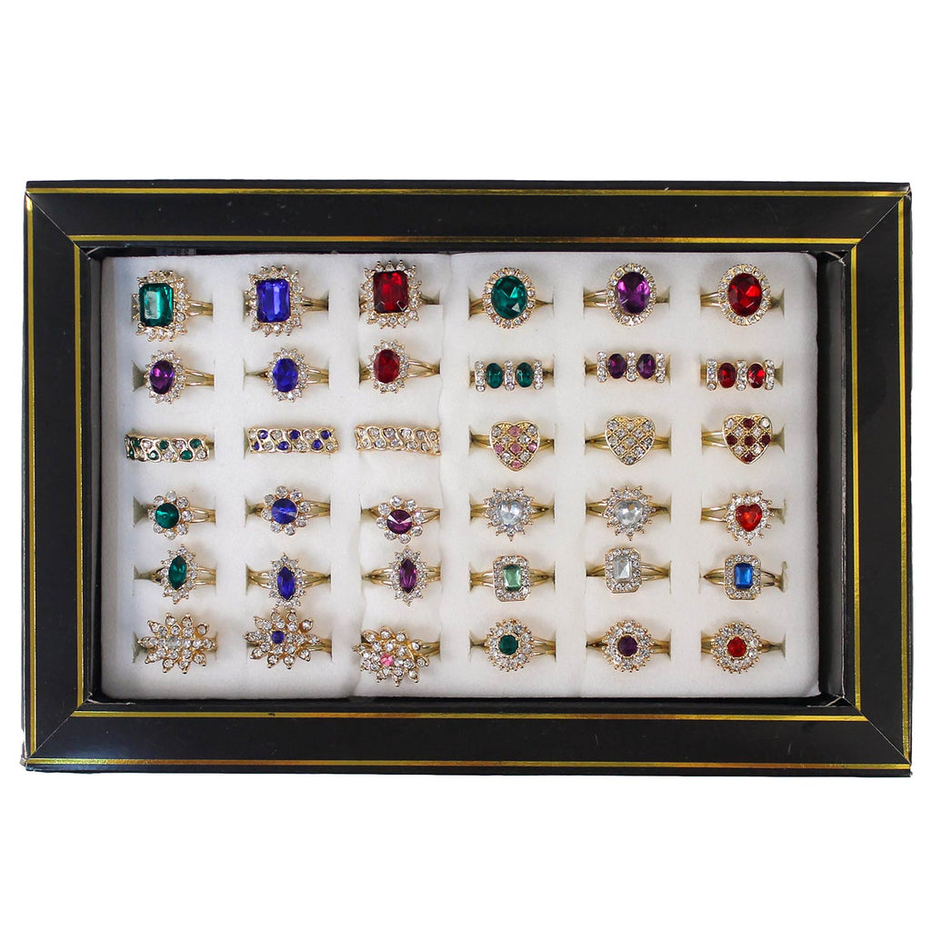 Inexpensive cocktail rings in assorted colors and styles. These costume jewelry rings are sized to fit most adults. Comes in box with kickstand for display.