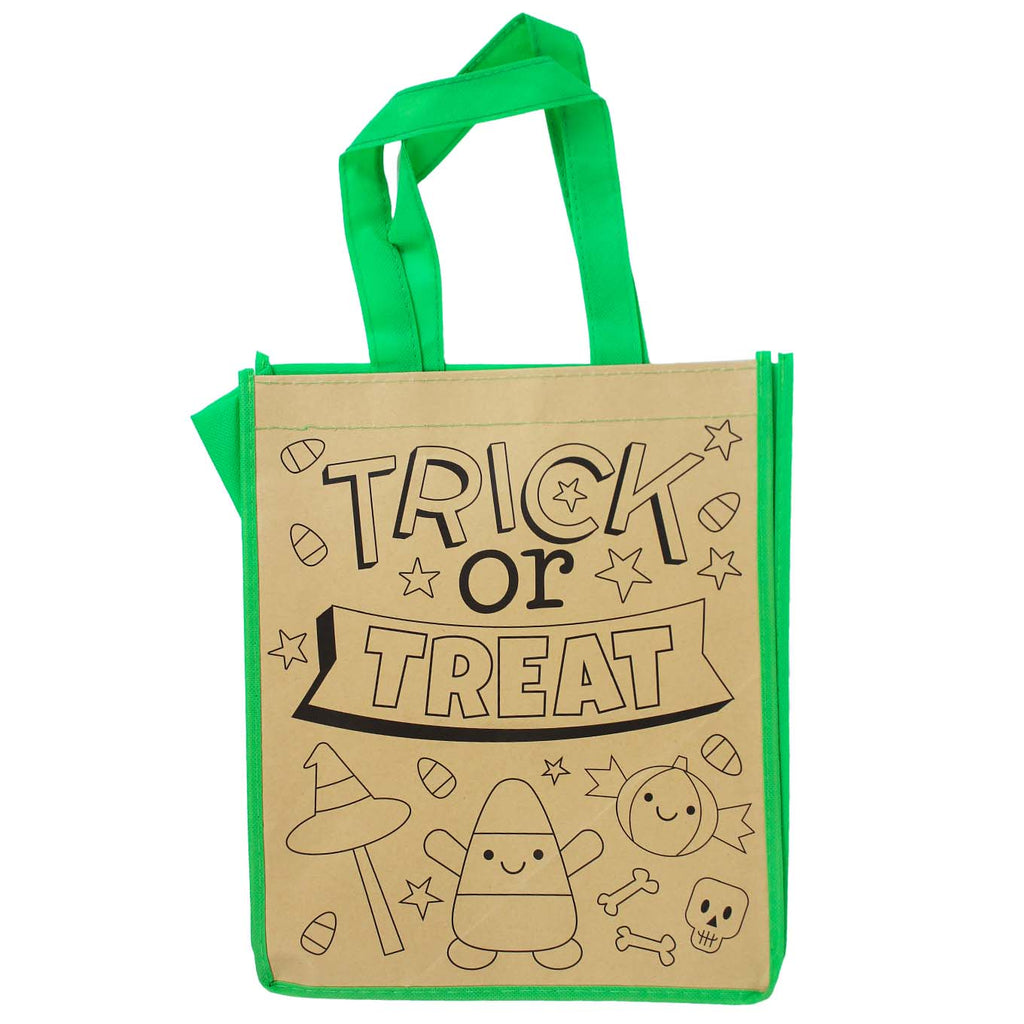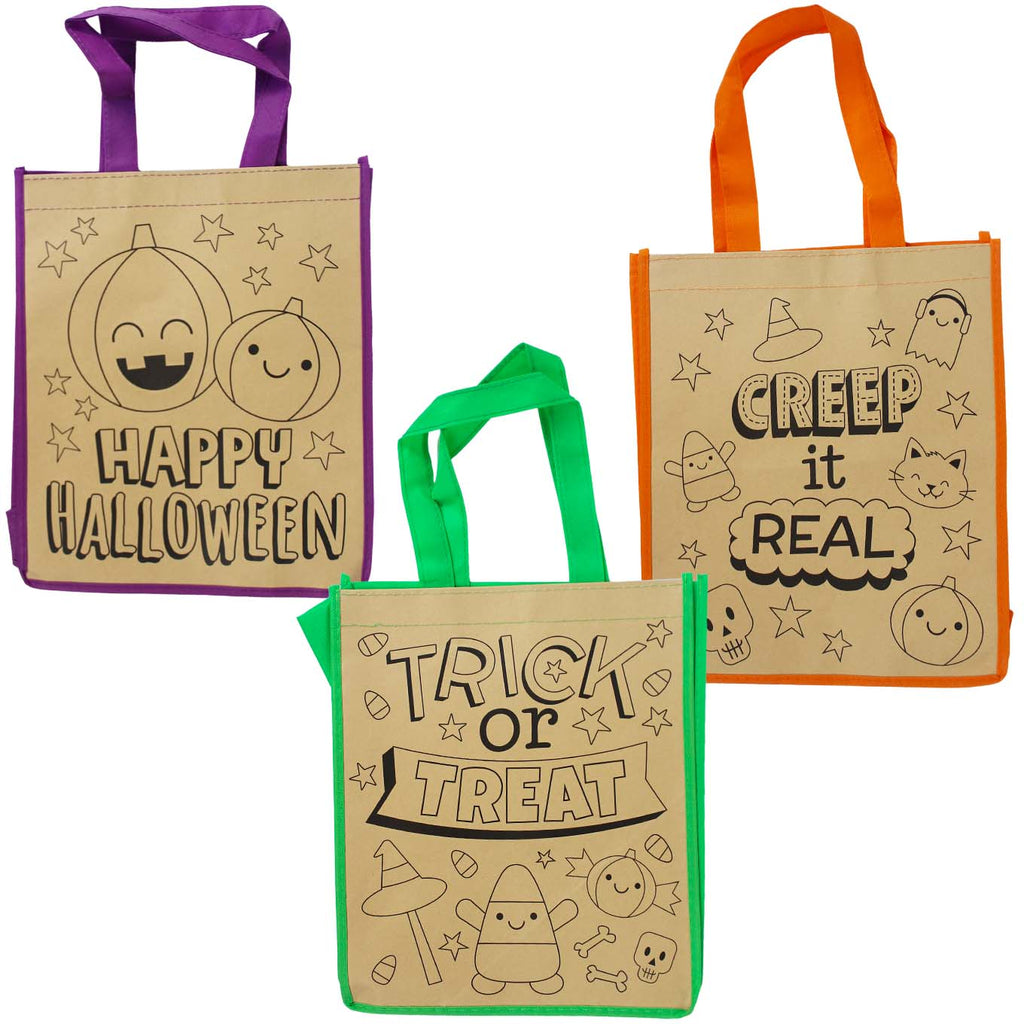 Assorted Halloween themed tote bags with one colorable side. These are good for carrying around or giving out trick-or-treat candy while showing off some extra Halloween spirit.