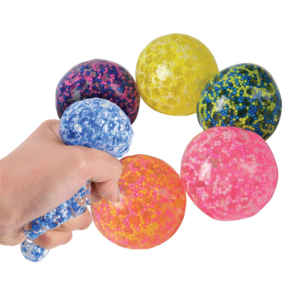 Squishy, rubbery DNA squeeze balls are filled with small beads and larger water beads for a molecular mashup that makes for a great stress reliever. 2", assorted colors. Includes 1 dozen balls.