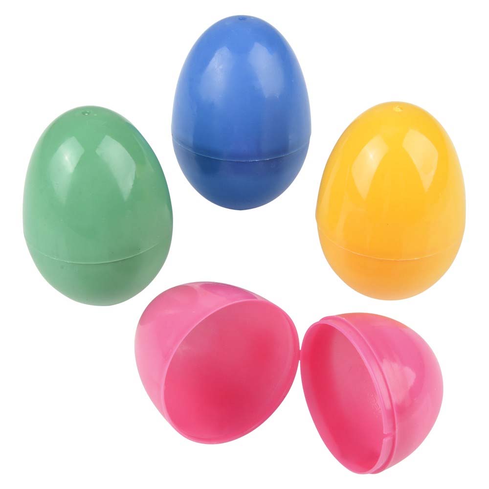 Bigger size, quality plastic Easter eggs in five colors with a hinge. Perfect for bigger candy and toys.