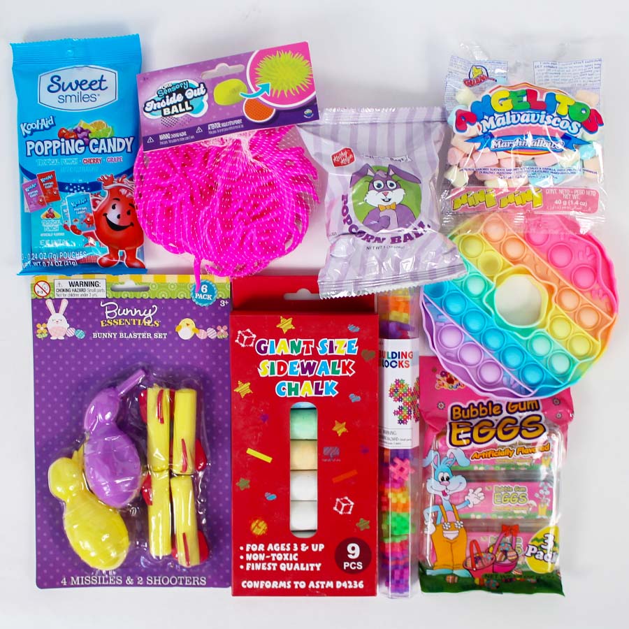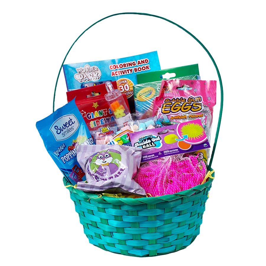 Each of our medium filled Easter baskets is stuffed with a fun variety of toys, activities and candy. The woven straw baskets are beautifully packaged and wrapped in cellophane.