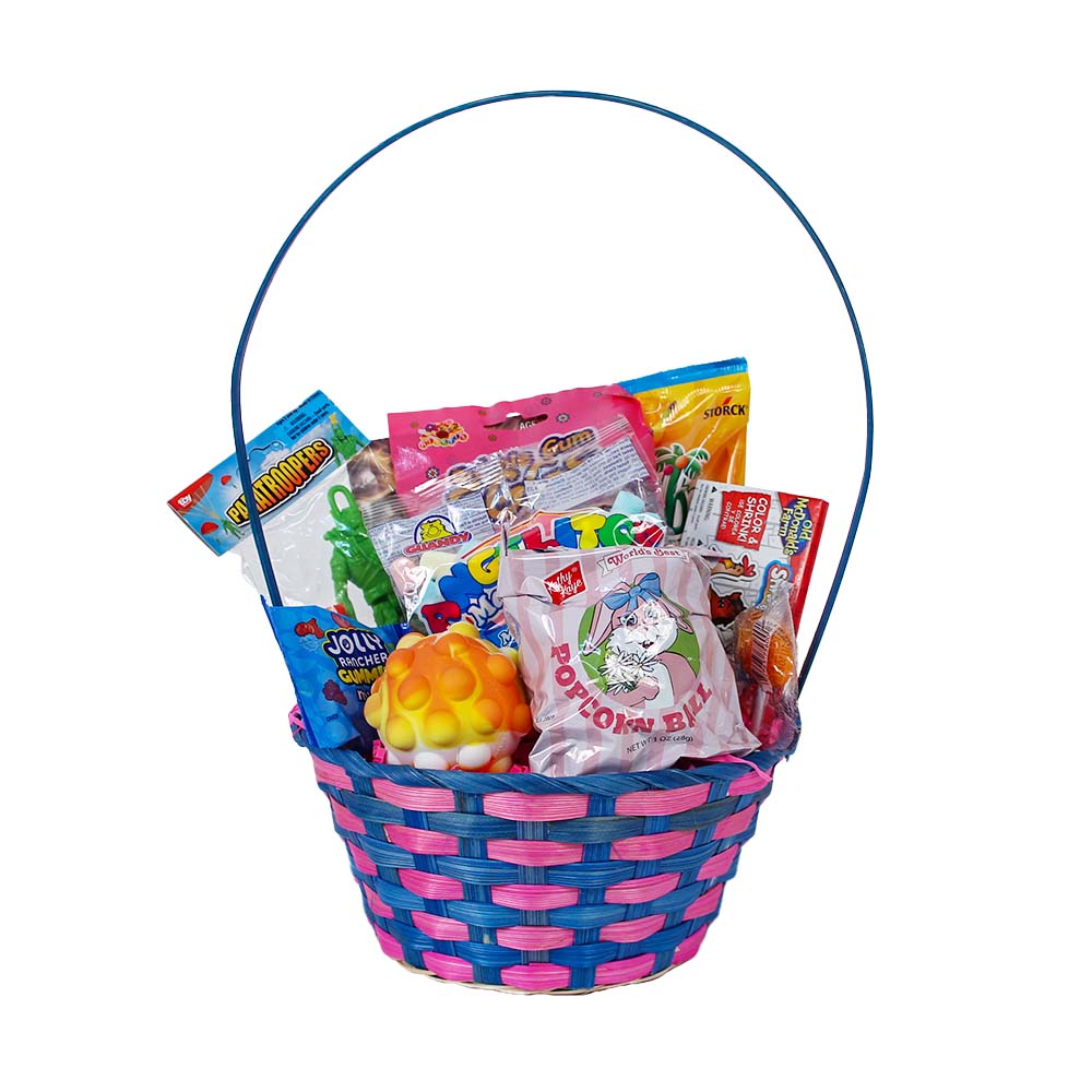 Our small size woven Easter basket filled with a child pleasing assortment of toys, activities and candy. Each filled Easter basket comes beautifully wrapped in cellophane.