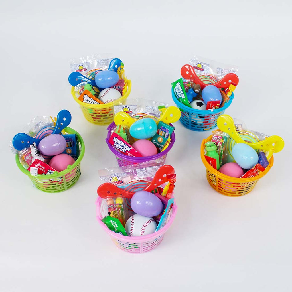 These small plastic baskets are great Easter giveaways. Each comes filled with a variety of candy and novelties and wrapped in cellophane.