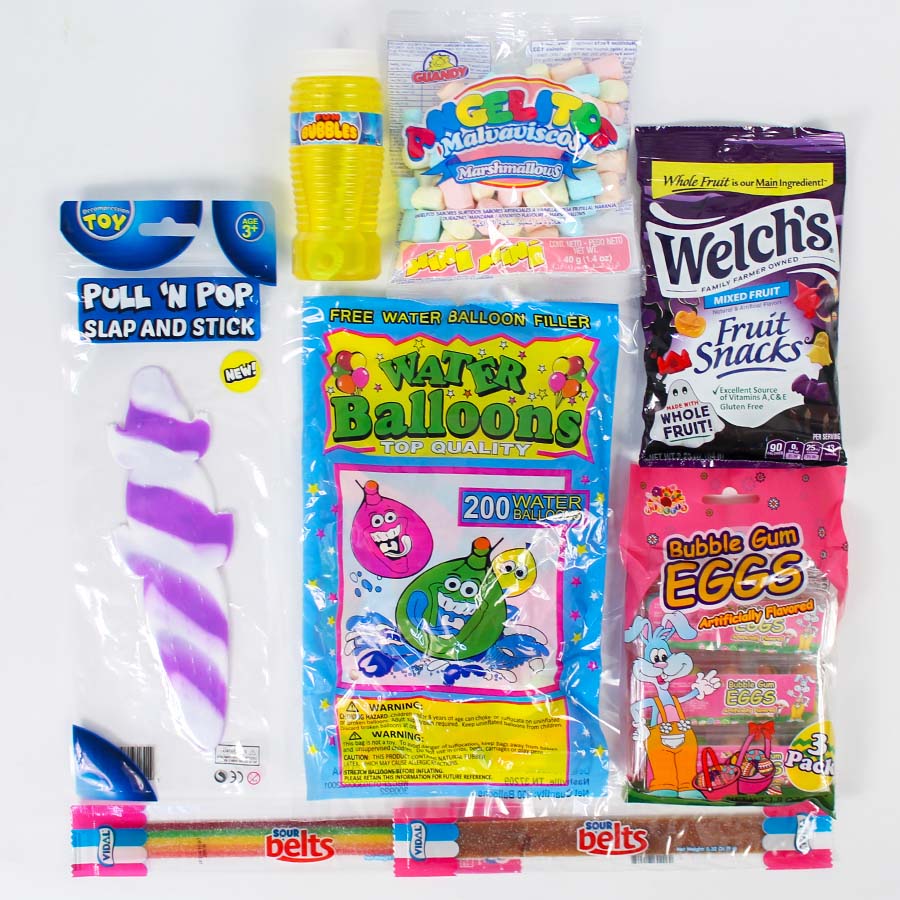 - Assorted egg colors, toys and candy types.