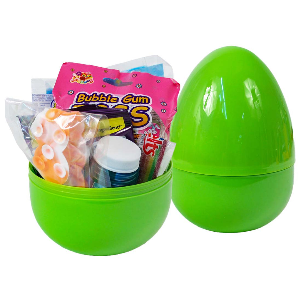 This extra large plastic Easter egg is absolutely stuffed with a great assortment of toys and candy. Our filled jumbo two piece eggs come in either blue or green.