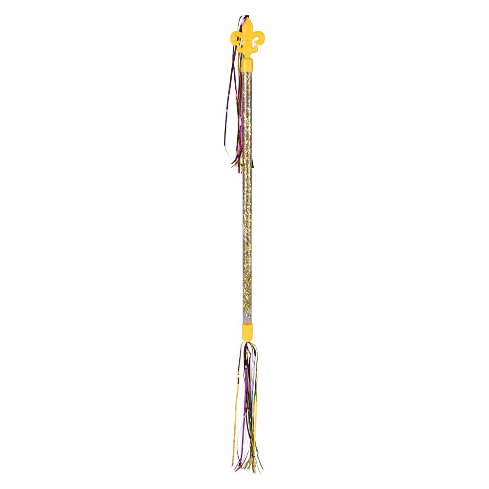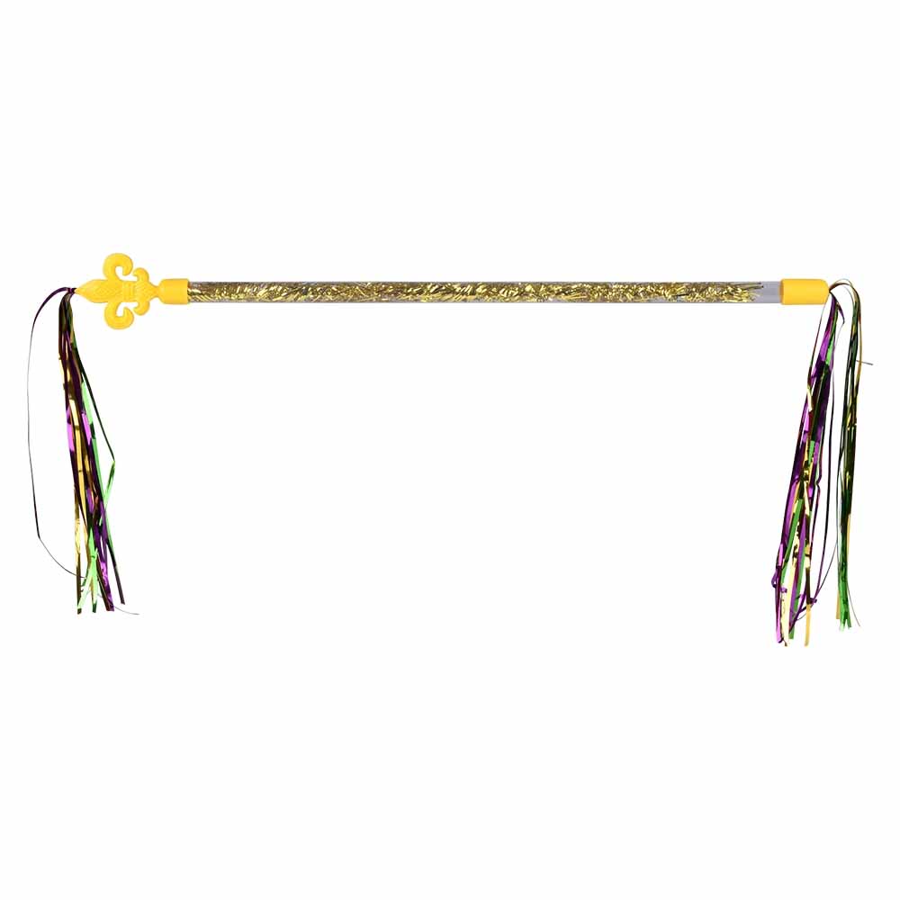 Make your Mardi Gras magical with these yellow and gold tinsel batons! Perfect for parades and parties, these batons will enhance your performance with their shimmery tinsel, flowing gold, green and purple ribbon and Fleur De Lis design.