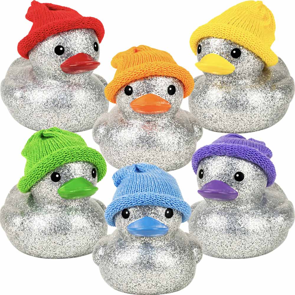 A glittery silver rubber duck in one of a variety of colors of knit caps with a matching bill. This larger size duck contains all the charm of a standard size rubber duck with much more flash.