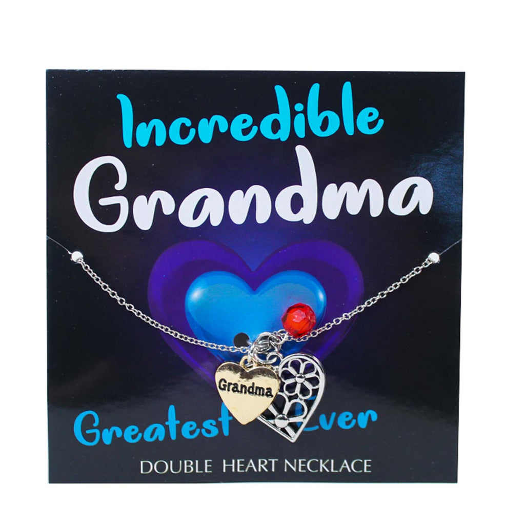 A silver chain necklace with two heart pendants and an opaque red bead. The bigger heart is silver and has a floral interior while the smaller is gold and says "grandma". A nice affordable option as a gift for grandma.