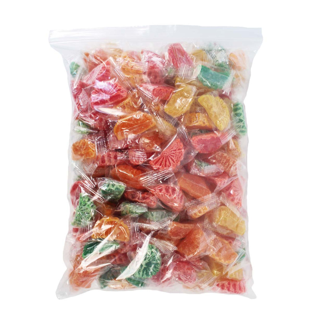 A bulk size bag containing 200 gummy fruit slices in four flavors. Flavors include cherry, orange, lemon and lime.