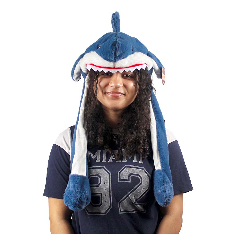A Hat-A-Mals™ plush shark hat with dangling arms. Squeeze the "hands" to make the side fins go up and down. Great for use by teams with shark mascots and for aquarium gift shops. These animal hats are one size fits most.