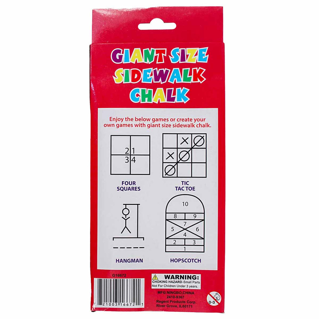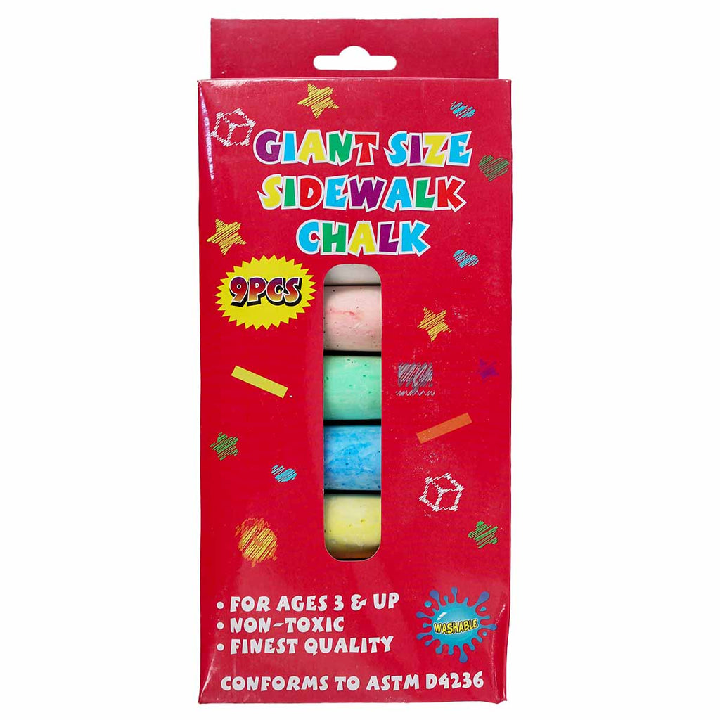 A 9 pack of non-toxic, washable, high quality 4" sidewalk chalk sticks in assorted colors. Perfect for a fun day in the sun at home or at the park.