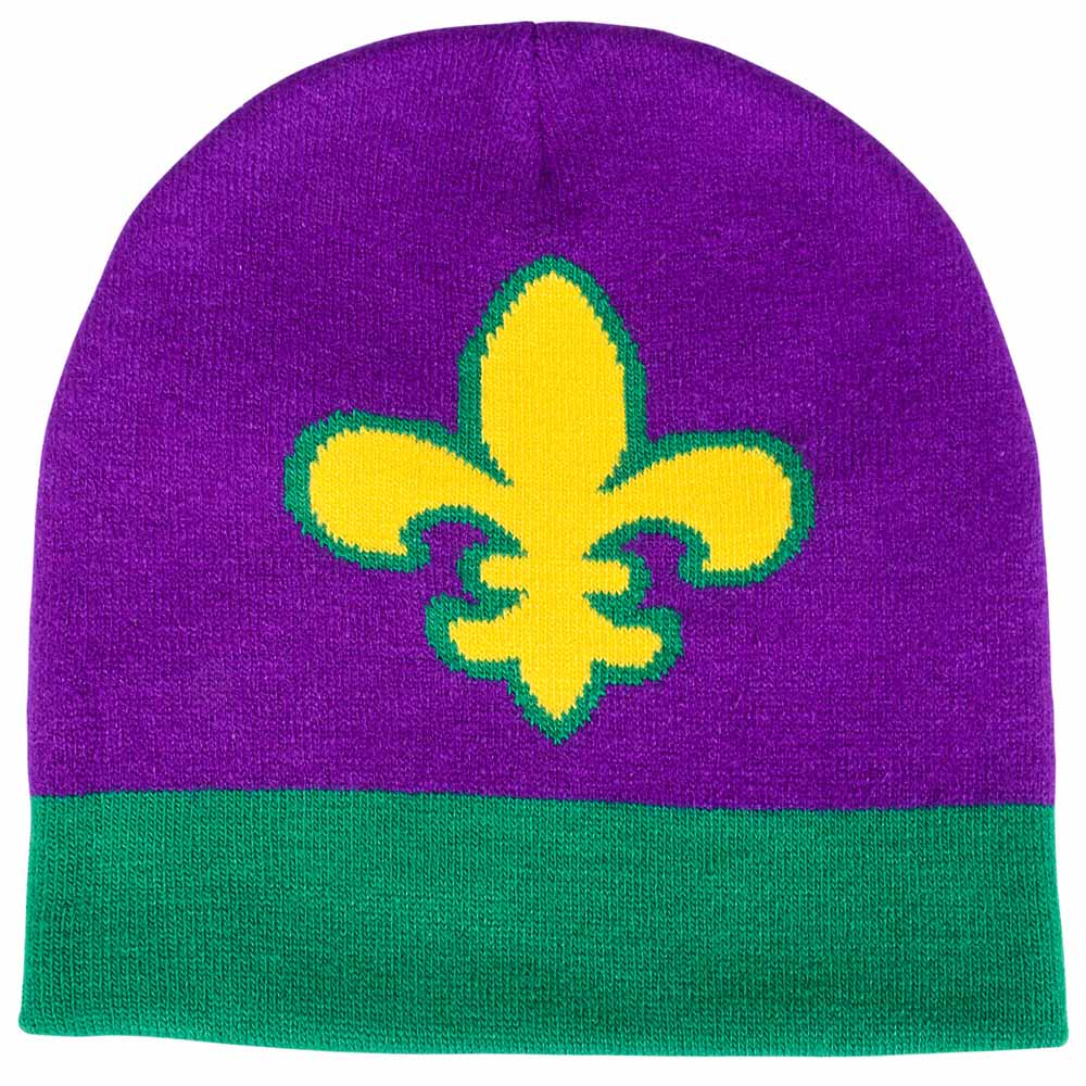 A knit beanie hat in Mardi Gras colors with a Fleur De Lis featured prominently on the front. Perfect for cold Mardi Gras mornings and nights and also as a stylish accessory, this beanie brings the comfort and fun, all in one piece of clothing.