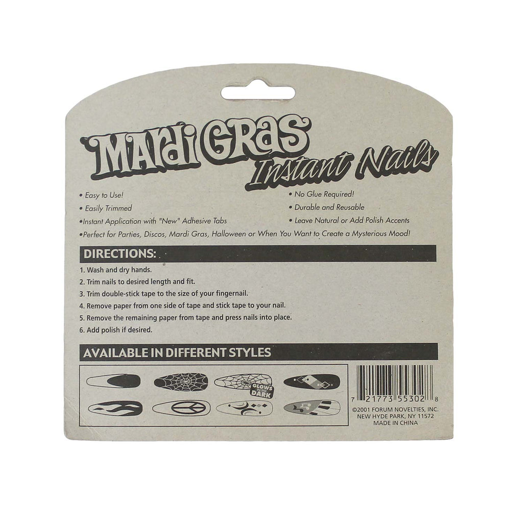 Mardi Gras designer false nails. Set of 10 sculptured nails with adhesive tabs. Easily trim to desired length. Durable and reusable.