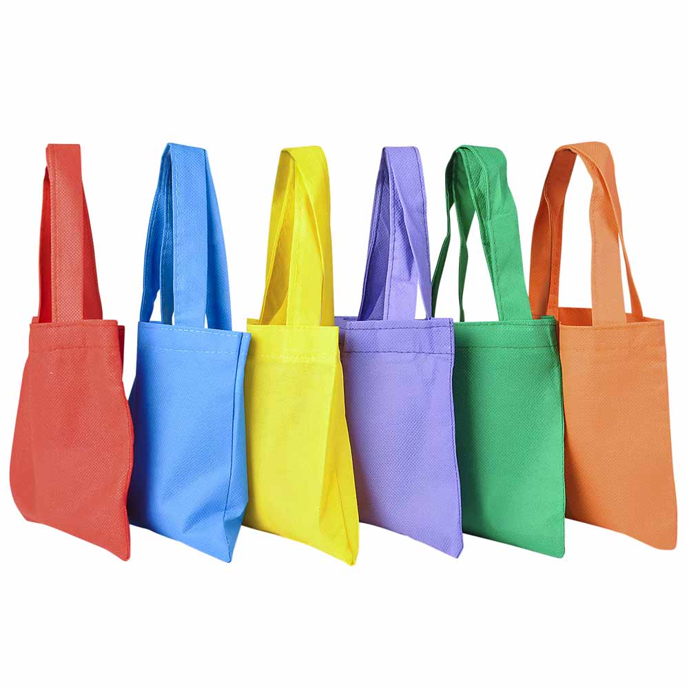 A collection of miniature tote bags in a variety of bright colors. Great for children who need a cute accessory to carry around school supplies, prizes or Easter eggs.