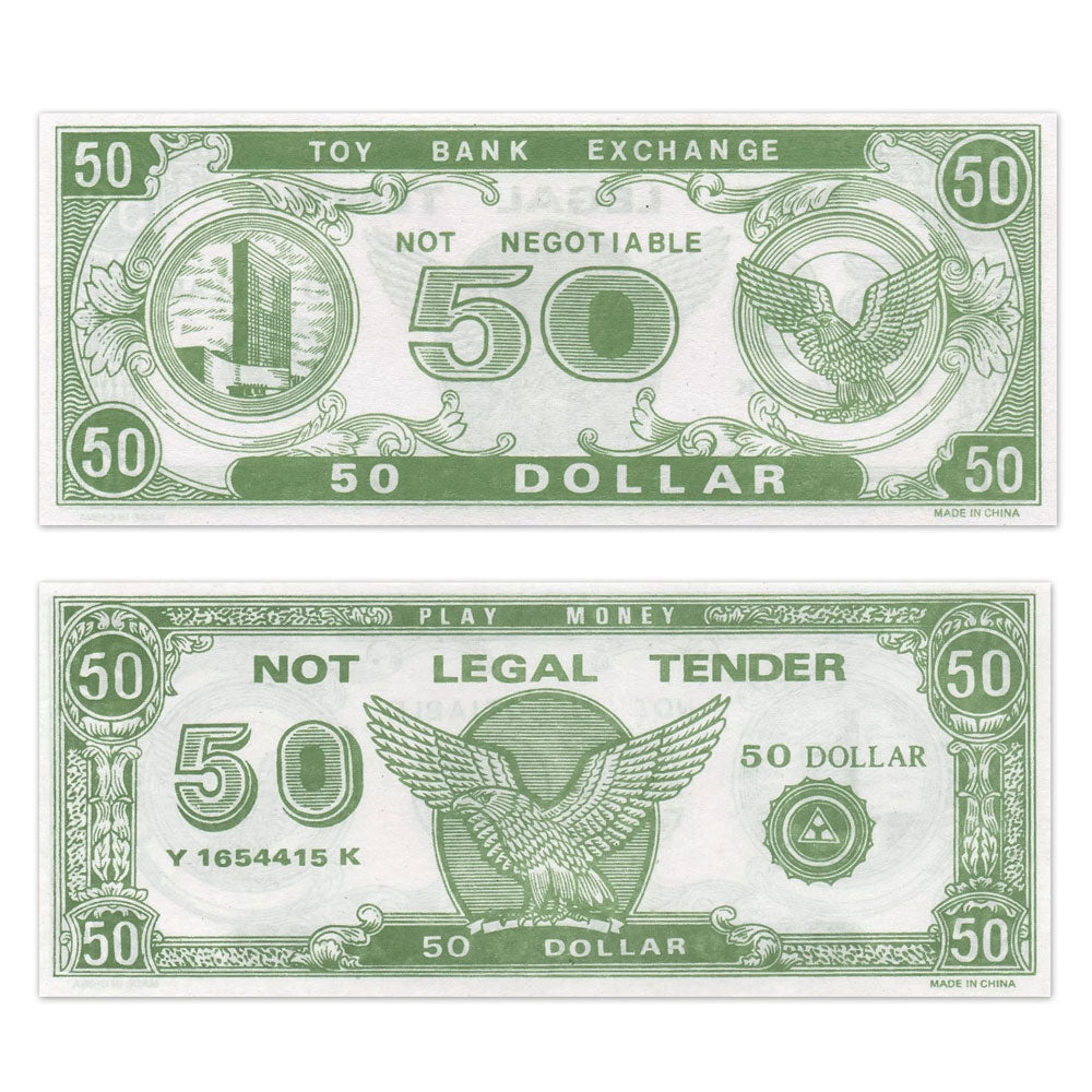Fake 50 dollar bills. Use this play money for your next poker night, with a board game or just for pretend play. Lightweight paper printed on both sides. 6" x 2-1/2". Styles may vary. Packed 1000 pcs.