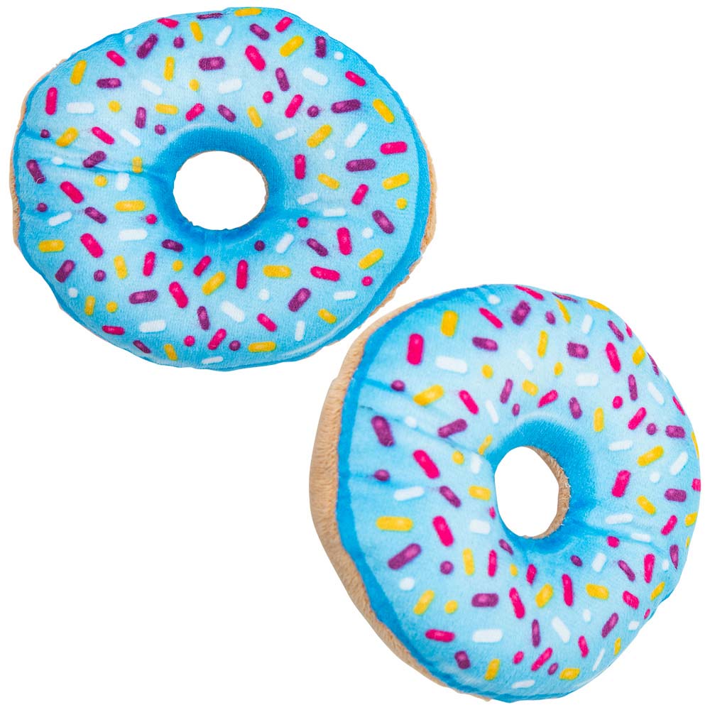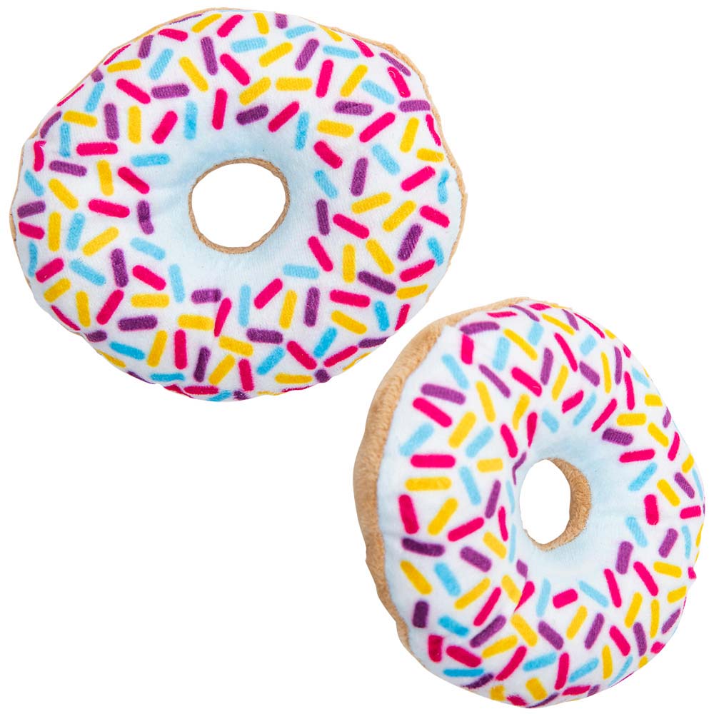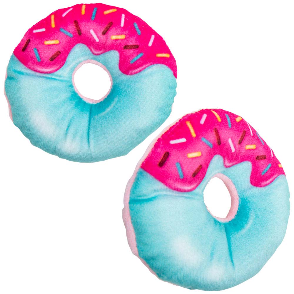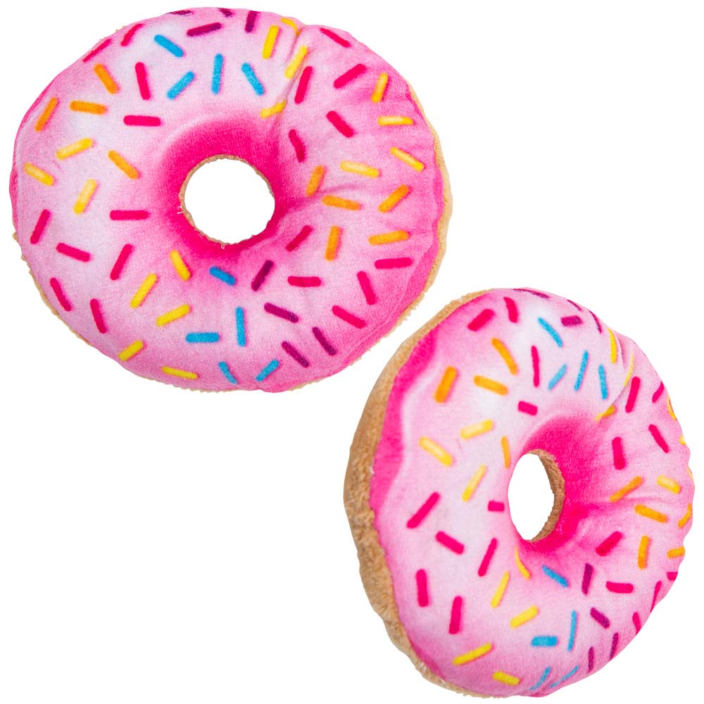 Colorful plush iced donuts with sprinkles on top. These plush toys are soft stuffed, making them just as great to hold as they are to look at. The label is sewn-in.