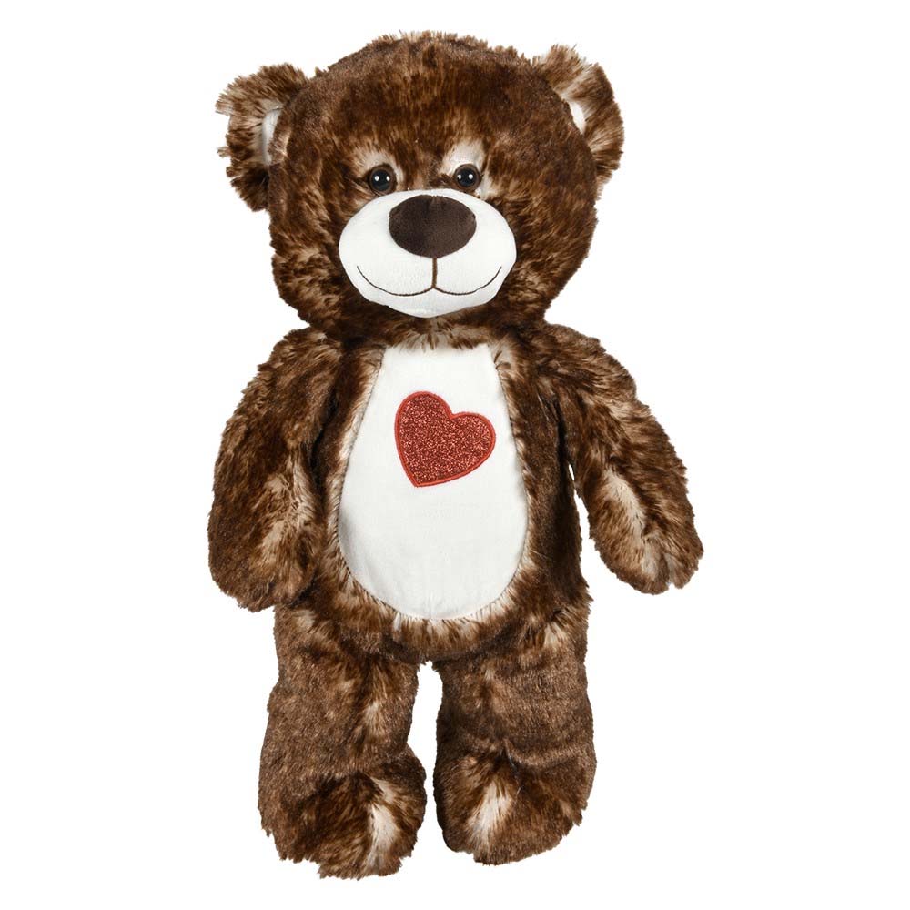 A soft teddy bear in one of three colors with an embroidered heart on its chest.