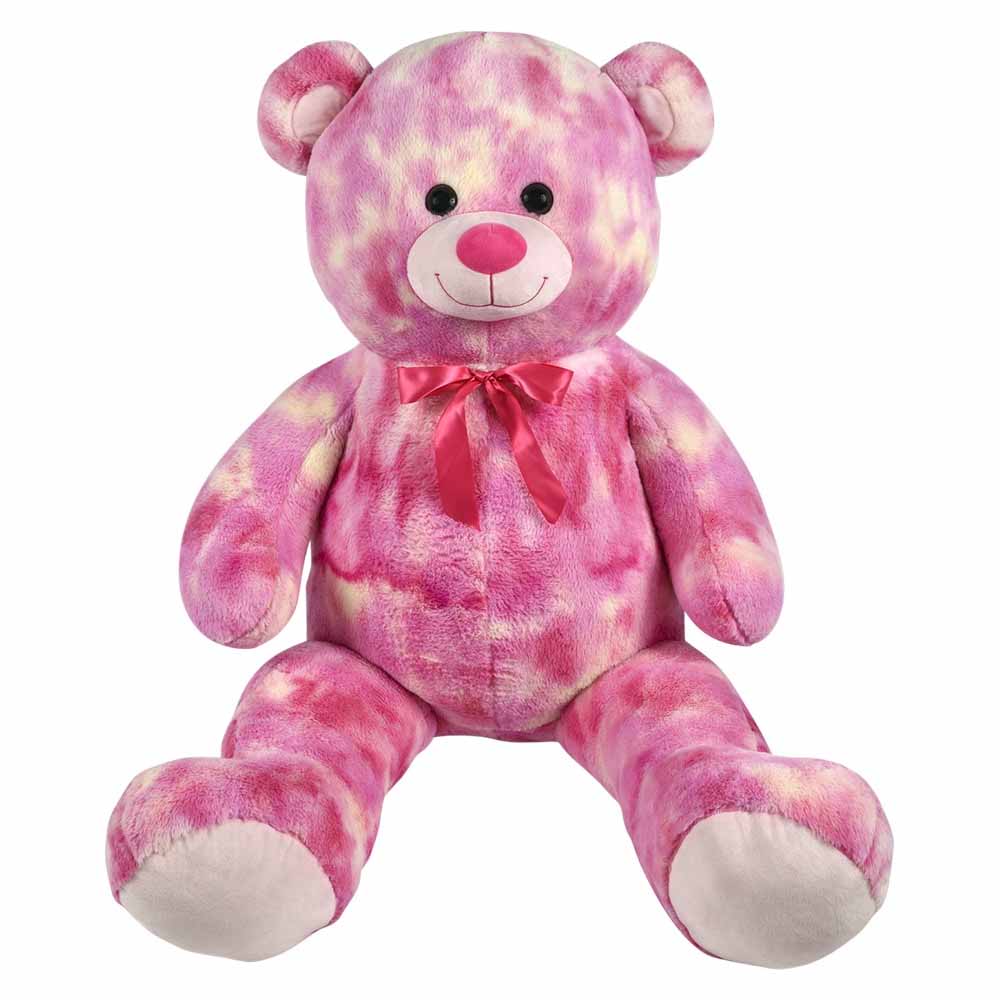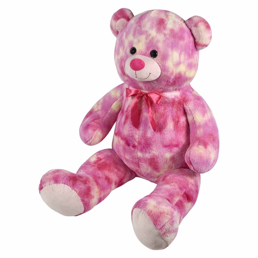 A giant bear stuffed animal with a Valentine's Day pink tie dye color. This plush comes with a matching bowtie and shiny, black plastic eyes. This is a a great plush for crane games or gifting.
