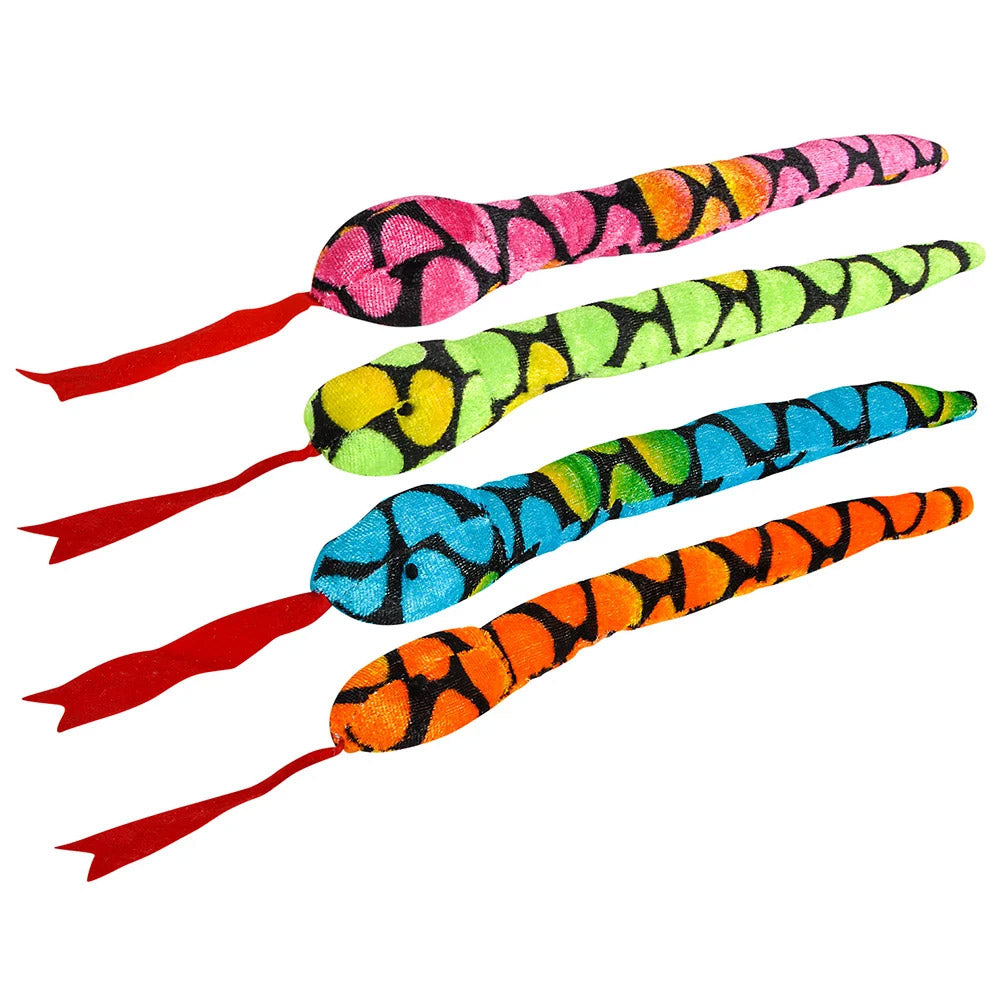 Colorful plush snakes in bright neon colors. These small size stuffed animal carnival prizes have an all-over scales design and felt tongue. Also available in other sizes!