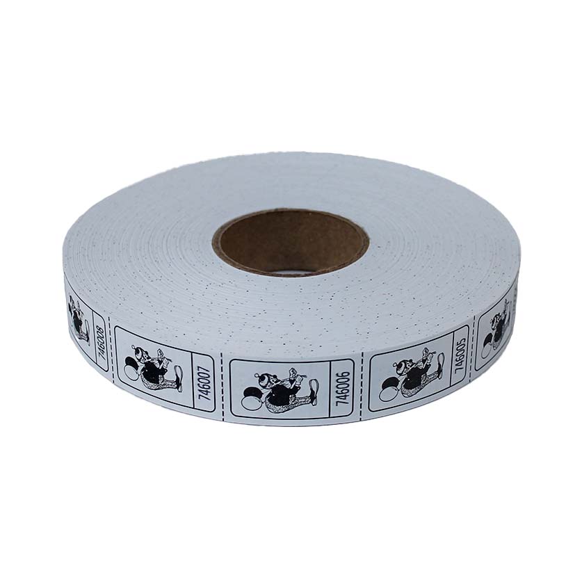 Roll of sequentially numbered and perforated white tickets with clown imprint. Each 1" x 2" ticket is printed on heavy card stock. For use at your carnival, festival or any event. Not for use in arcade machines.