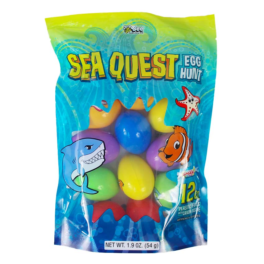 A bag of twelve Easter eggs in six different colors, each imprinted with an aquatic animal on one side and filled with a roll of Smarties candy. A great option for a small Easter hunt or Easter basket filler.