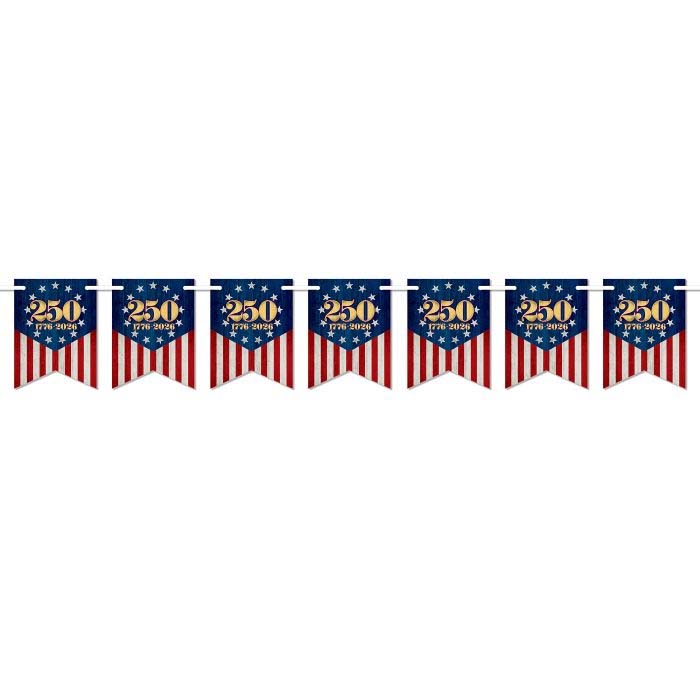 Celebrate 250 years of American history with this semiquincentennial streamer! Measuring 6" x 5'6", this decoration is great for hanging above walkways and doorways or along banisters.