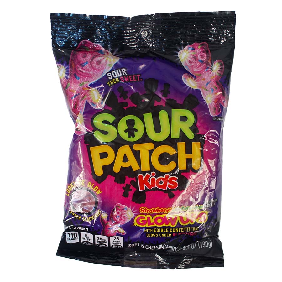 A bag of Sour Patch Kids Strawberry-Watermelon Glow Ups. This soft and chewy candy is covered in edible confetti that glows under blacklight.
