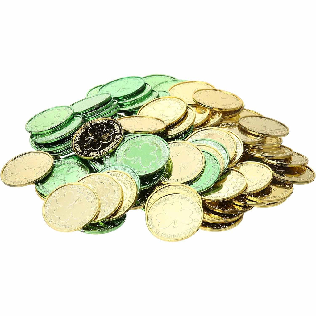 Green and gold plastic coins adorned with shamrocks and "Happy St. Patrick's Day." These are great for decorating tables or filling holiday goodie baskets with style.