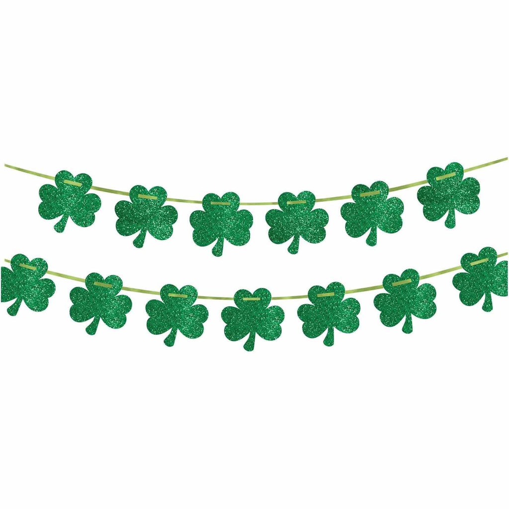 A glitter paper shamrock banner, perfect for St. Patrick's Day decoration. Hang this on a wall, across a large doorway or along a banister to bring in that festive holiday feel.