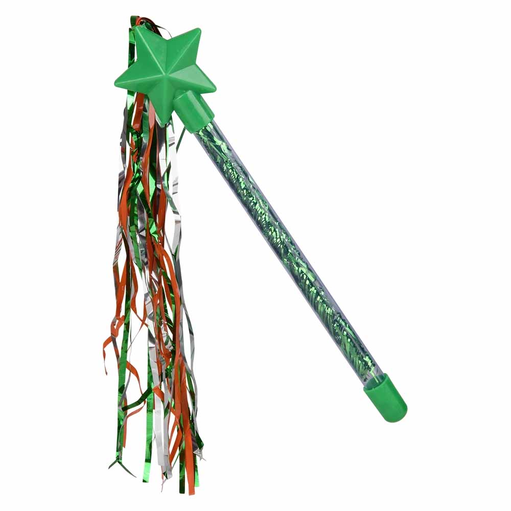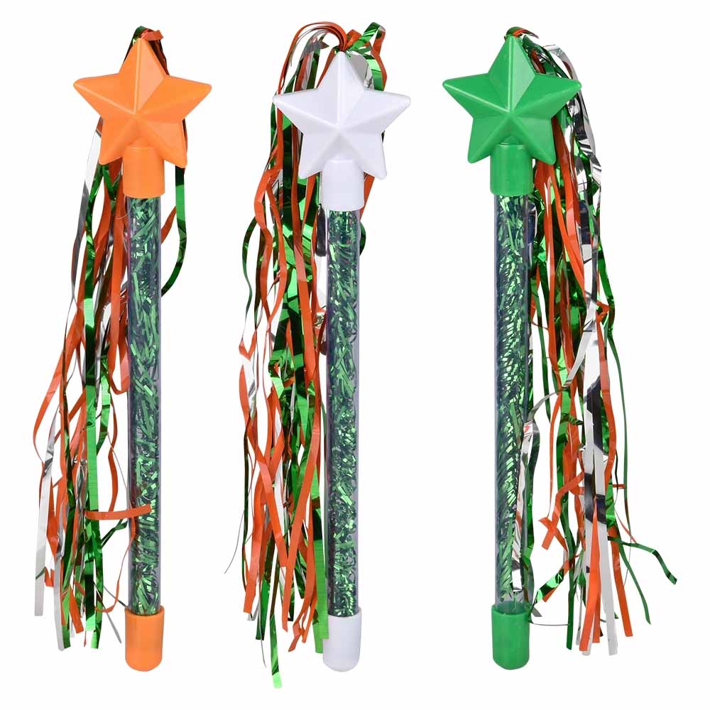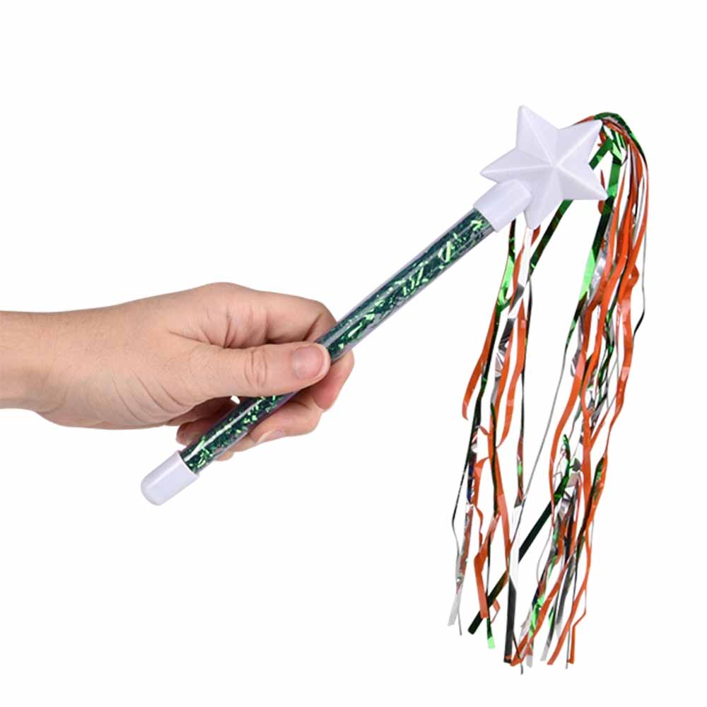 Make your St. Patrick's day magical with these orange, green and white tinsel wands! Perfect for parades and parties, these wands are sure to help you shine with their shimmery tinsel, flowing ribbon and star on top.